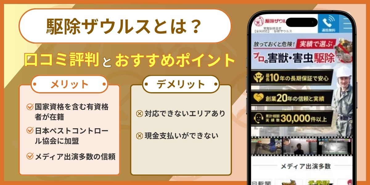 駆除ザウルスは、完全自社施工・最長10年保証・ペストコントロール協会加盟の3つを強みに持つ、信頼性の高い害獣・害虫駆除専門業者です。