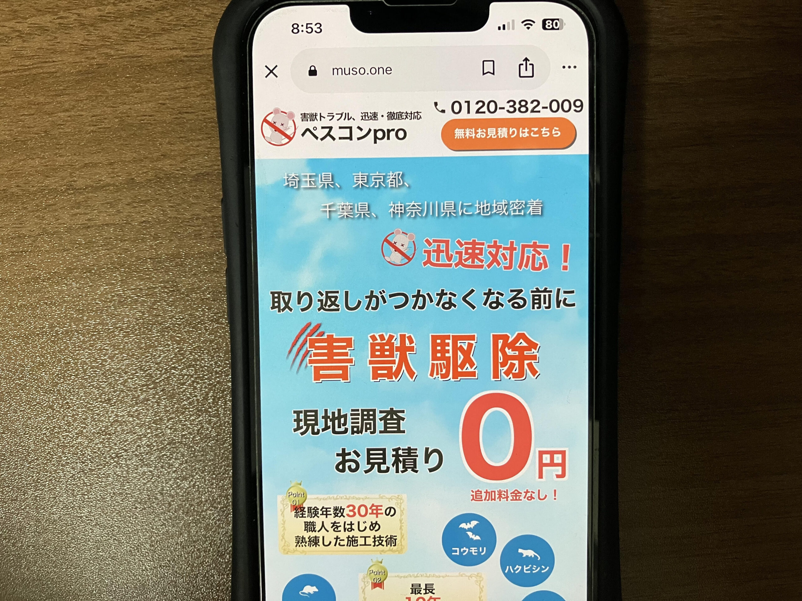 料金的には相見積りした他社さんよりは高めでしたが、床下、天井裏、屋根裏、戸袋、外壁などを確認して、作業が必要な箇所とその説明を踏まえて、(ユーモアを交えながら)明朗な見積もりを提示してくれたペスコンproさんにお願いしました。